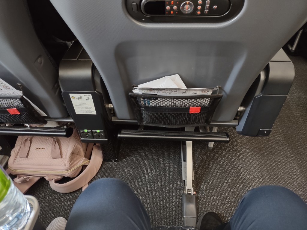 Below the IFE screen are the expected headphone socket and a powered USB-A slot for charging your small electronics. Next to the screen is the obligatory coat hook. Between the seats under the seat-back pocket is a dual universal power socket if you need to power larger devices.