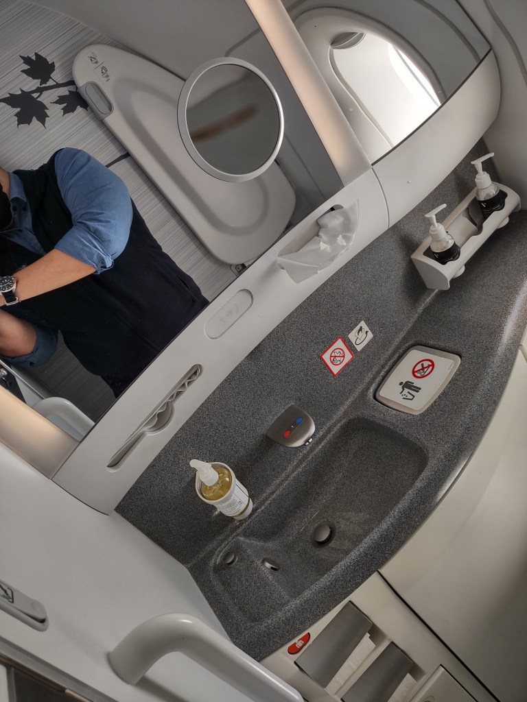 The lavatories were tastefully decorated with maple leaves as expected of the Canadian flag-carrier. One neat thing on these Dreamliners is the lavatory between the premium economy and business cabins have a view!