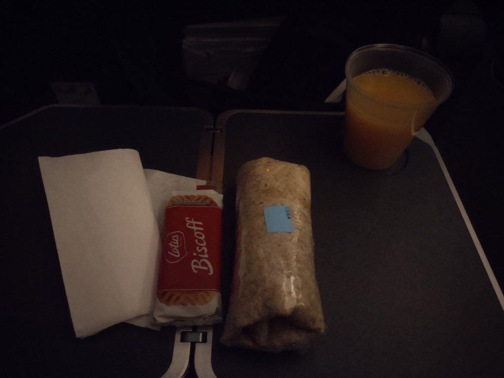 About 2/3 of the way over the Pacific, a mid-flight meal consisting of a tuna salad wrap and Biscoff cookie was served alongside another drink service which was great timing as I was feeling a bit peckish after my marathon of movies and intermittent naps.
