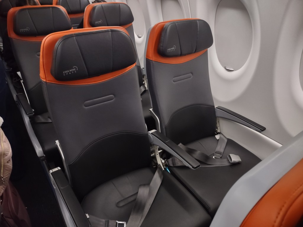 The seats measure 18.6 inches (47 cm) wide and normally have 32 inches (82 cm) of pitch. Even More Space seats located at the front of the cabin and at the exit rows have a slightly roomier 35 inches (89 cm) of pitch and are marked by orange highlights. All seats recline approximately 3 inches (7.6 cm).