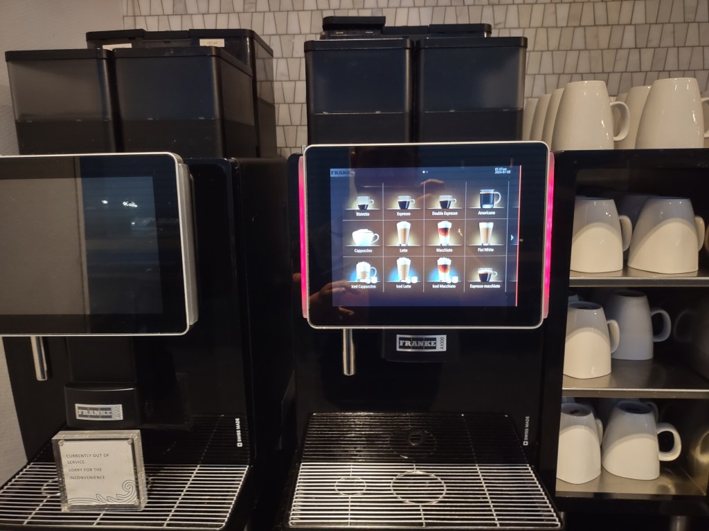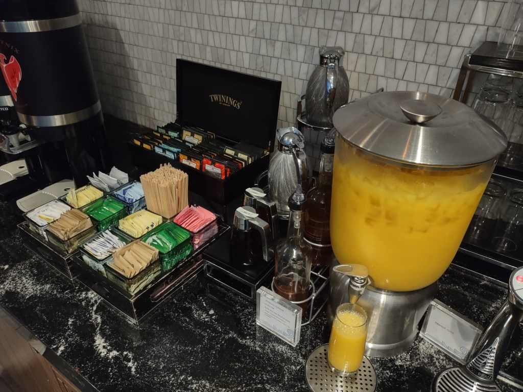 As you walk along the back hallway towards the the buffet, you are first met by the beverage station complete with coffee/espresso machines, self-brew tea, and orange juice.