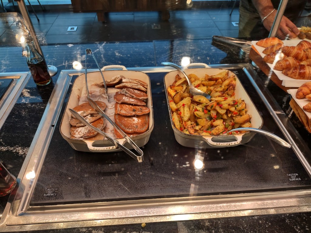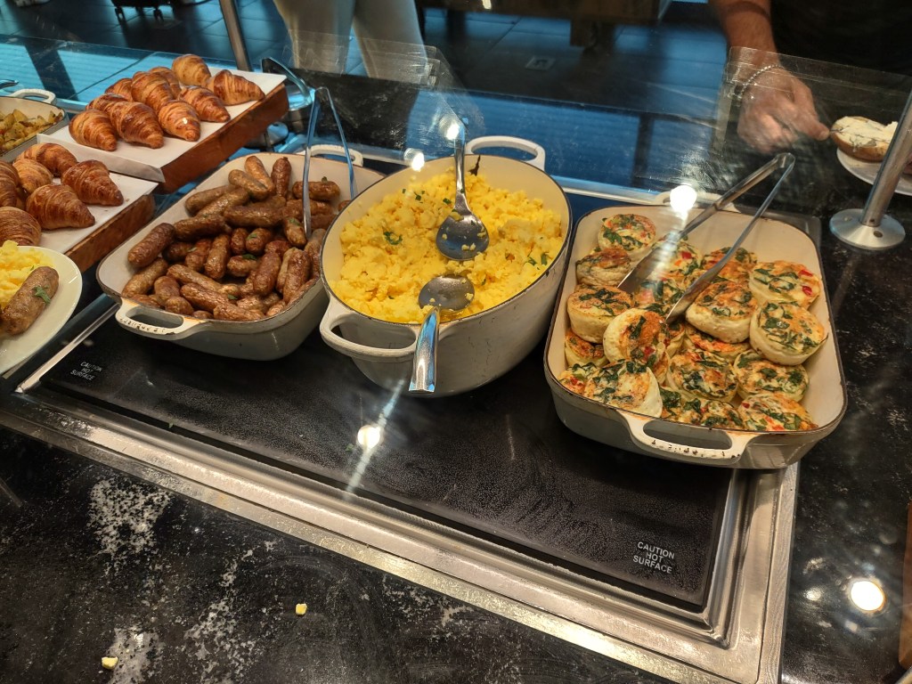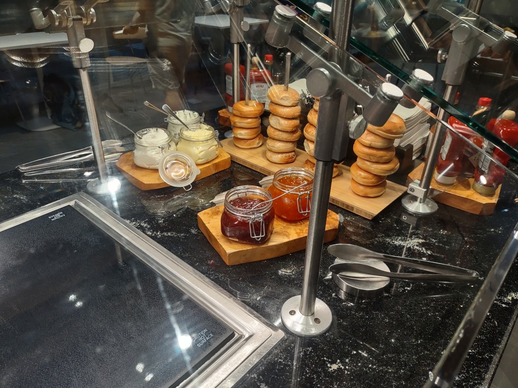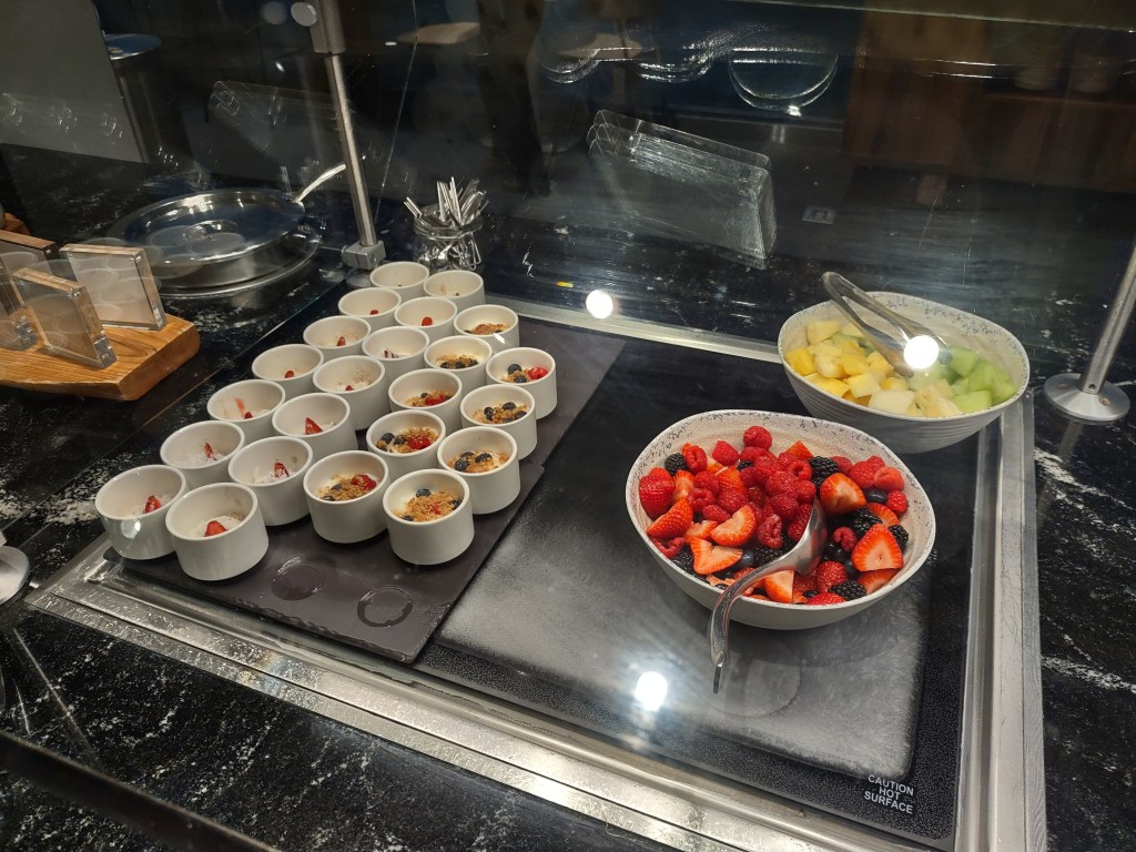 After passing the beverage station, you reach the main buffet area which has two sections for cold and hot options. On the cold side you’ll find various fruit options as well as yogurt and granola cups. Here you’ll also find bagels and accompanying spreads.